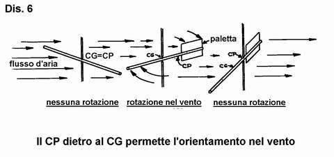 nel modello in corrispondenza del CG e di esporlo ad una corrente d’aria costante. Il modello si orienterà nel vento come fosse una banderuola, con le pinne dal lato opposto a quello dal quale soffia il vento (Dis. 6).